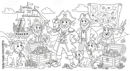 Drawing to paint pirate coloring page for kids featuring treasure map ship and crew for fun and educational activity time vector