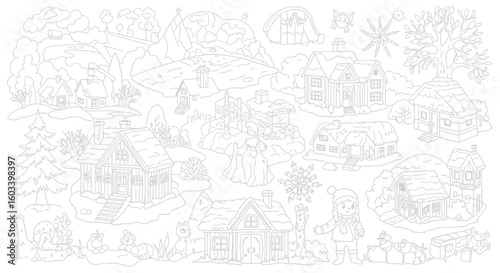 Drawing to paint winter village coloring page for kids and adults christmas holiday scene with houses and snow landscape art drawing vector