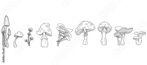 Drawn mushrooms outline illustration in linear style. Suitable for coloring books, botanical projects, packaging design, scientific articles and decoration. Mushrooms on transparent PNG background.