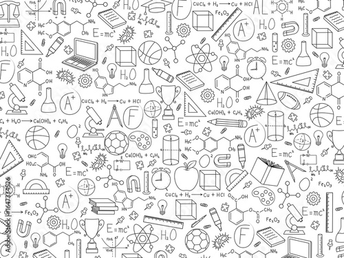 Drawn school formulas, physics, chemistry, geometry, biology, atoms, bacteria, microscope, books, notebooks. Back to school. School background for design. Scientific equipment drawn with lines.