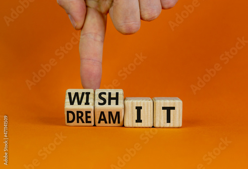 Dream and wish it symbol. Businessman turns cubes and changes words 'dream it' to 'wish it'. Beautiful orange table, orange background. Business and dream and wish it concept. Copy space.