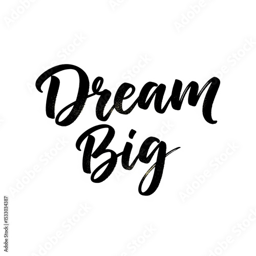 Dream Big” bold brush calligraphy with gold ink effect, inspiring mood, minimal white background