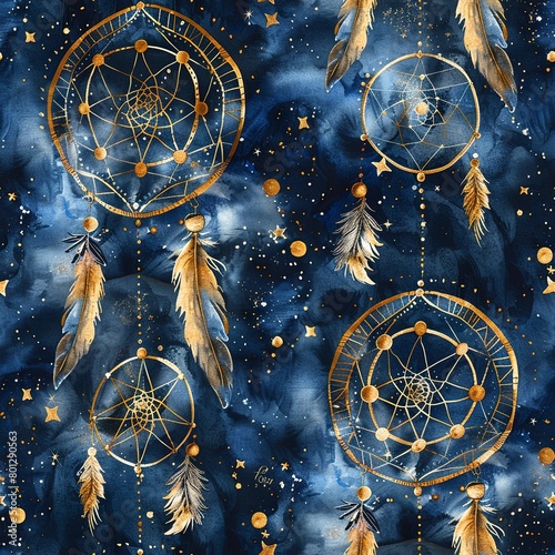 Dreamcatchers and starlight, cosmic boho watercolor, seamless pattern, shimmering golds on navy, celestial dreams. Seamless Pattern, Fabric Pattern, Tumbler Wrap, Mug Wrap.