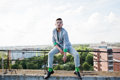 Dreamer stylish macho man in gray suit and glasses posed on the roof.