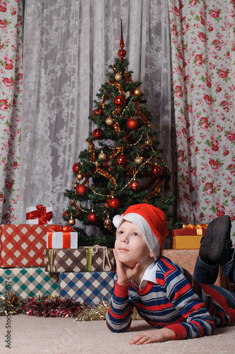 dreaming boy in front of the christmas tree