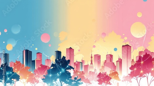 Dreamlike Cityscape Pastel City at Dawn with Illuminated Trees