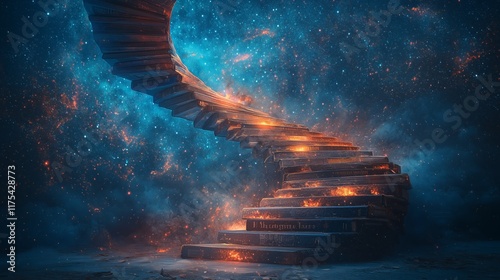 Dreamlike Staircase Ascending Through Cosmic Space with Books