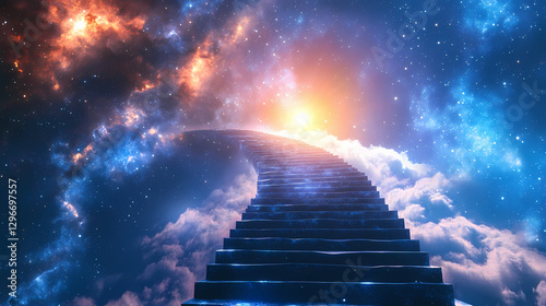 Dreamlike stairway leads up towards a bright starry cosmos. Infinite Cosmic Stairway. Illustration