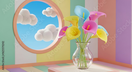 Dreamy concept art of a pastel interior with a bouquet of vibrant calla lilies and a view of the sky through a circular window.