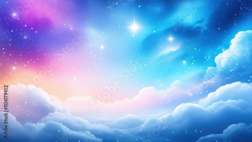 Dreamy night sky, ethereal clouds, vibrant nebula, cosmic swirls, starry expanse, pink and blue gradient, celestial landscape, magical atmosphere, glowing stars, fantasy skyscape, surreal space scene,