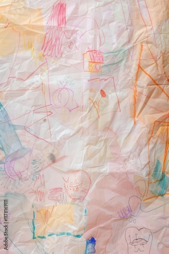 Dreamy Pastel Kids' Art, Serene abstract scene of kids' sketches and doodles on crumpled paper in pastel colors.
