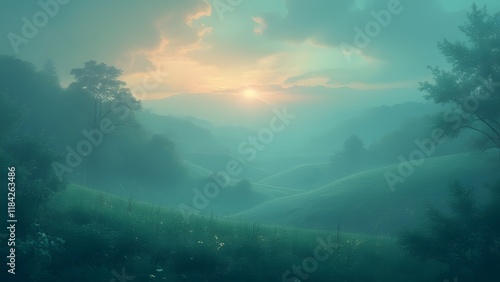 Dreamy Pastel Teal Landscape, Ethereal Sunrise Over Misty Rolling Hills and Lush Green Meadows