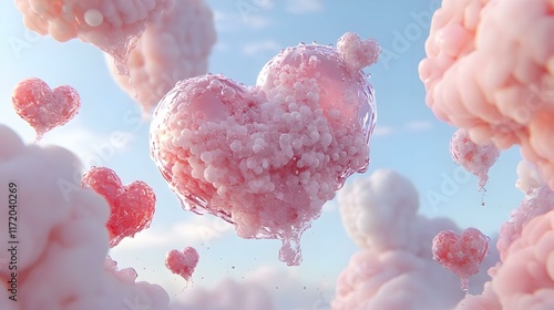 Dreamy Pink Hearts Floating Among Whimsical Cloud Forms in Sky