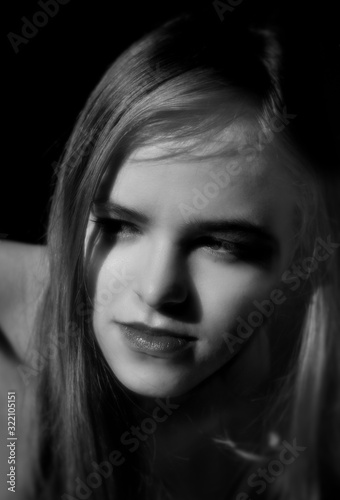 Dreamy Portrait of a young girl in hollywood style.Black & white.