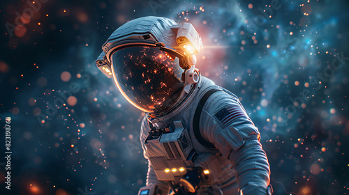 Dreamy space explorer with a glowing helmet, surrounded by purple cosmic elements