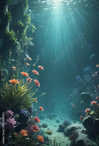 Dreamy underwater scene, blurred flora & water, mystical, depth of field, peaceful