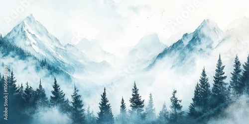 Dreamy watercolor scene of mountains and fog-covered pine trees, with a serene forest atmosphere, softly painted on a transparent background