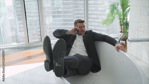 Dressed guy in the bathroom. A businessman in a suit lies in the bathroom and talks on the phone
