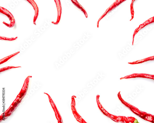 Dried chili peppers isolated on white background top and bottom arrangement. Flat layout