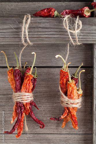 Dried chili peppers on a wooden background. bunch of dry red and orange peppers handing on a rope on a wooden background