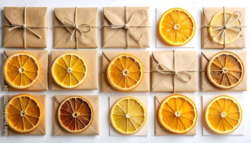 Dried Citrus Slices and Brown Paper Packages Tied Up with String on White