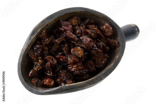 dried cranberries on a primitive, wooden, scoop, isolated