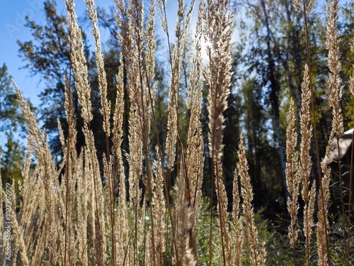 Dried ears of grass, sedge against the background of the backlight of the sun and against the background of the forest