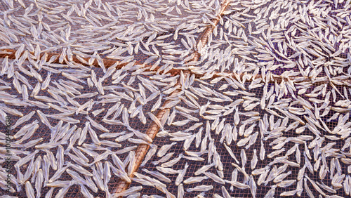Dried fish on nylon mesh in drying system from sunlight, seafood preservation background
