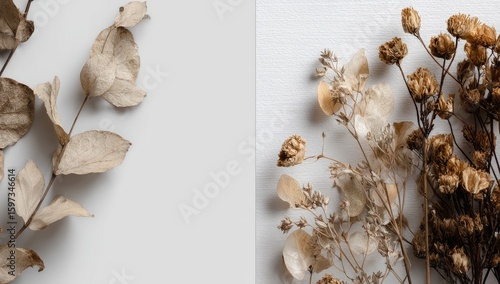 Dried floral arrangement on light background. Two halves, pale beige/brown