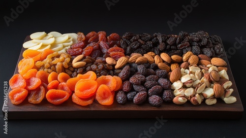 Dried fruits and nuts in wooden bowls on the table. Oriental sweets.