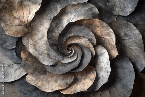 Dried leaves arranged in a mesmerizing spiral, showcasing autumn's beauty and nature's artistry.