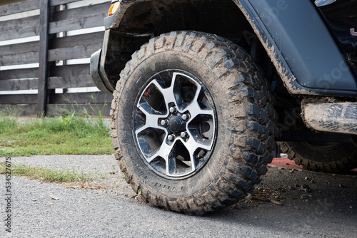 Dried mud on SUV's off-road mud tires. Close up low angle view, no people
