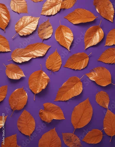 Dried orange metallic leaves, violet backdrop Geometric leaf pattern, autumnal vibe , surface, element