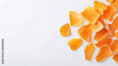Dried papaya chunks scattered on white background, showcasing vibrant orange color and unique texture