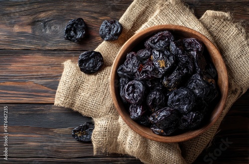 Dried plums in a wooden bowl on rustic burlap texture with scattered fruits on wooden surface, healthy snack concept with rich dark color and natural elements