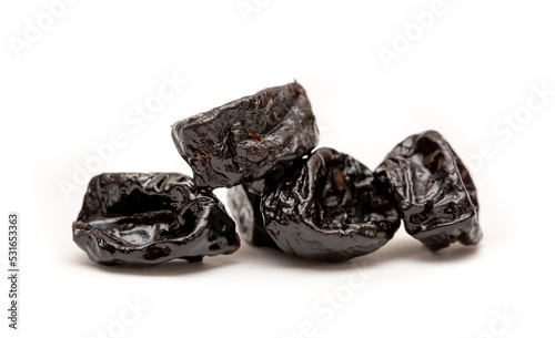 Dried prunes close-up as a background. Prunes isolated on white background.