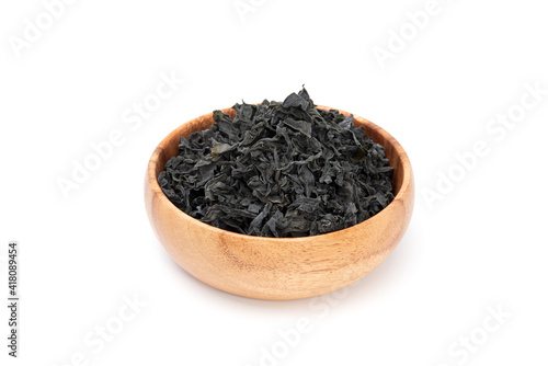 Dried seaweed wakame in wooden bowl isolated on white background. Japanese food