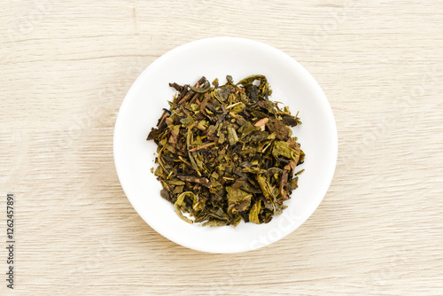 Dried tea leaves on bowl, copy space
