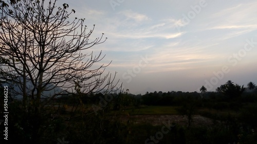 Dried tree after sunset with a slight tint of greenery in the background and dusky sky with clouds with hints of blue and orange