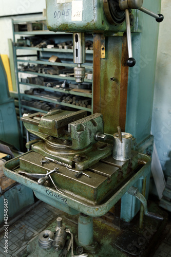 Drilling machine in the old shop. Drilling machine parts and spindle with drills.
