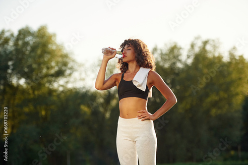 Drinking water from a bottle. Young fitness woman is on the field outdoors
