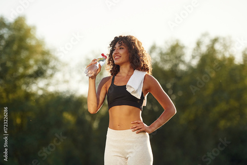 Drinking water from a bottle. Young fitness woman is on the field outdoors