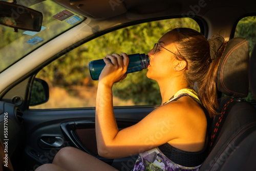 drinking water from a plastic bottle inside a car