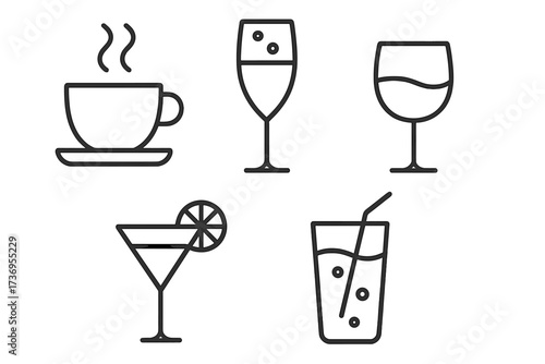Drinks and beverages icon set. Coffee, wine, cocktail, champagne, juice. Line art vector illustration for cafe or bar menu. Editable stroke pictogram collection. Simple symbols.