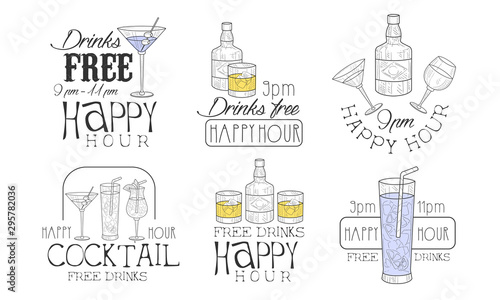 Drinks Free Hand Drawn Retro Labels Set, Happy Hour Monochrome Badges Vector Illustration