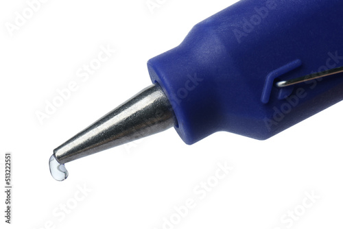 Dripping hot glue from gun on white background, closeup