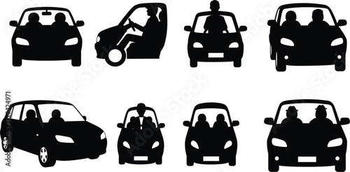 Driver and passengers in car, vehicle silhouette illustration, driver silhouette, front view, side view, rear passengers, transportation concept, automotive seating arrangement