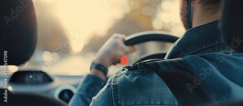 Driver buckling seatbelt, getting ready for next stop.