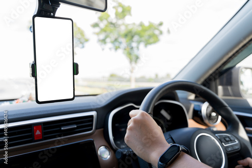 Driver holding steering wheel with smartphone on dashboard mount inside modern car