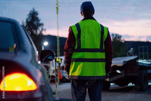 driver wearing reflective vest at towing site at dusk